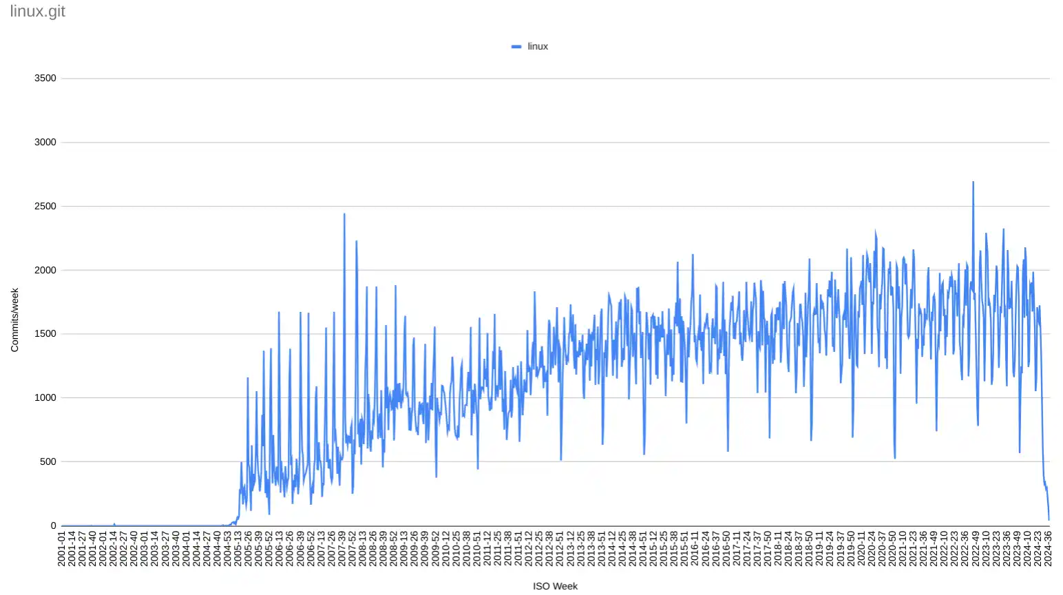 The Linux kernel main repository linux.git is a pretty active project with 1600 commits per week. The Linux kernel uses the git merge workflow.