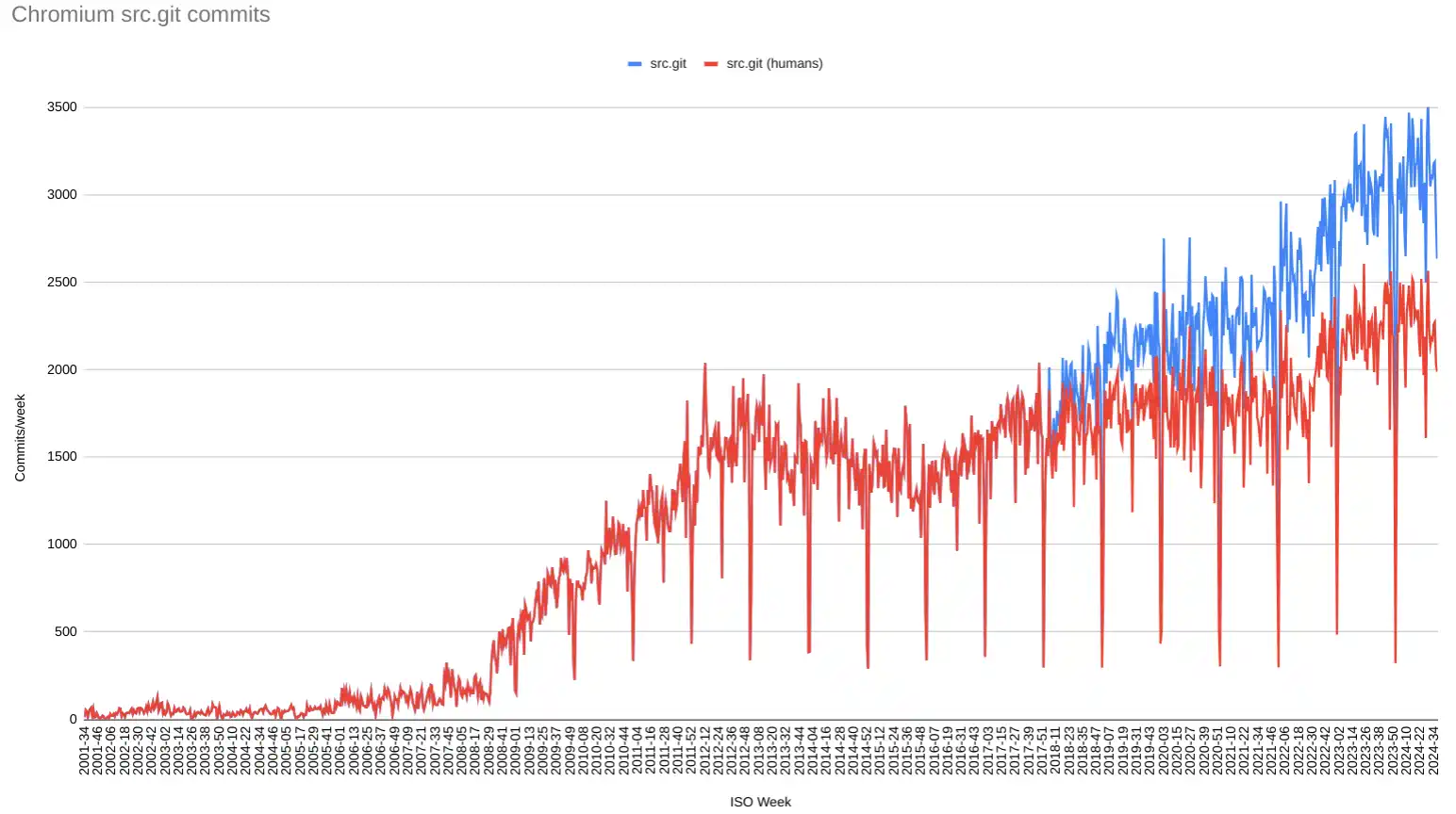 Note that I didn’t try to filter out automated commits so human generated changes are likely a bit lower than that. I know that in the past folks were running scripts at the desk doing automated commits on their behalf. I hope it’s not the case anymore.